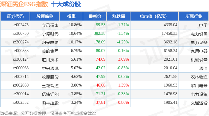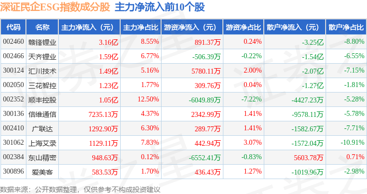 资金流向方面,深证民企ESG(970056)指数成份股当日主力资金净流出合计39.75亿元,游资资金净流入合计10.43亿元,散户资金净流入合计29.31亿元。成份股资金流向详情见下表: