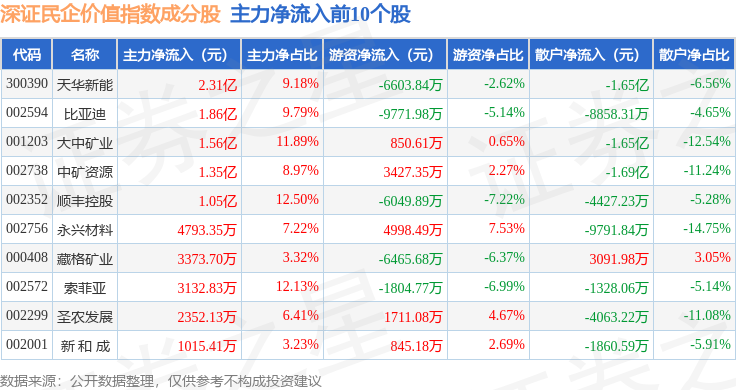 资金流向方面,深证民企价值(970072)指数成份股当日主力资金净流出合计6.5亿元,游资资金净流入合计3960.22万元,散户资金净流入合计6.1亿元。成份股资金流向详情见下表: