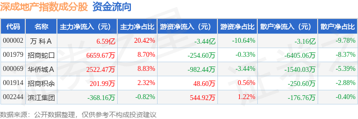 资金流向方面,深成地产(971001)指数成份股当日主力资金净流入合计7.49亿元,游资资金净流出合计3.5亿元,散户资金净流出合计4.0亿元。成份股资金流向详情见下表: