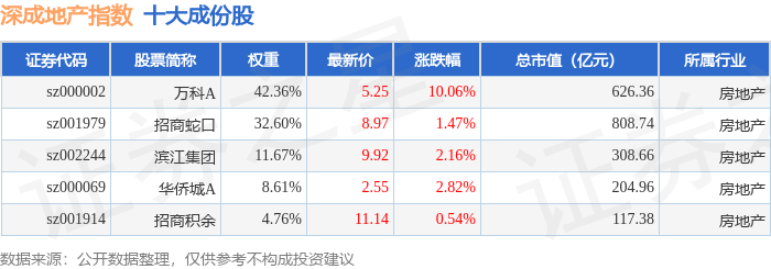 证券之星消息,12月10日,深成地产(971001)指数报收于438.73点,涨4.85%,成交48.14亿元,换手率3.09%。当日该指数成份股中,上涨的有5家,万科A以10.06%的涨幅领涨。