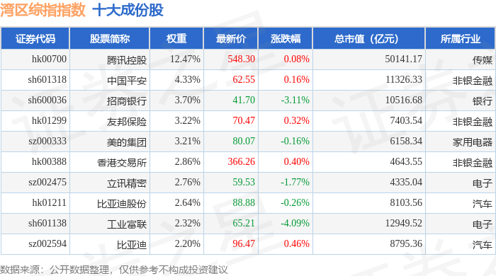 证券之星消息,12月10日,湾区综指(980003)指数报收于2830.11点,跌0.48%,成交2004.34亿元,换手率0.82%。当日该指数成份股中,上涨的有171家,万科企业以13.17%的涨幅领涨,下跌的有143家,思摩尔国际以7.17%的跌幅领跌。