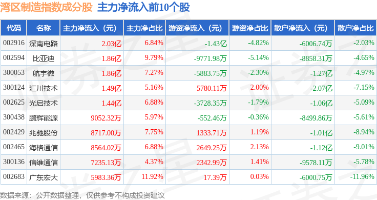资金流向方面,湾区制造(980009)指数成份股当日主力资金净流出合计48.75亿元,游资资金净流入合计7.73亿元,散户资金净流入合计41.02亿元。成份股资金流向详情见下表:
