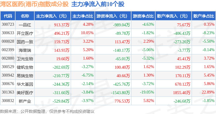 资金流向方面,湾区医药(港币)(980014)指数成份股当日主力资金净流出合计3.88亿元,游资资金净流出合计1580.93万元,散户资金净流入合计4.04亿元。成份股资金流向详情见下表: