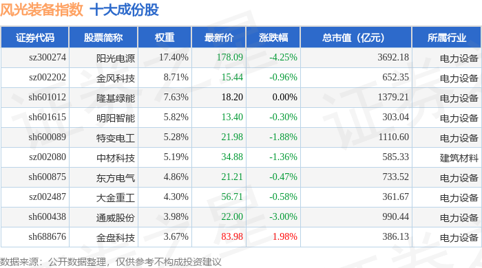 风光装备(980026)指数十大成份股详情如下: