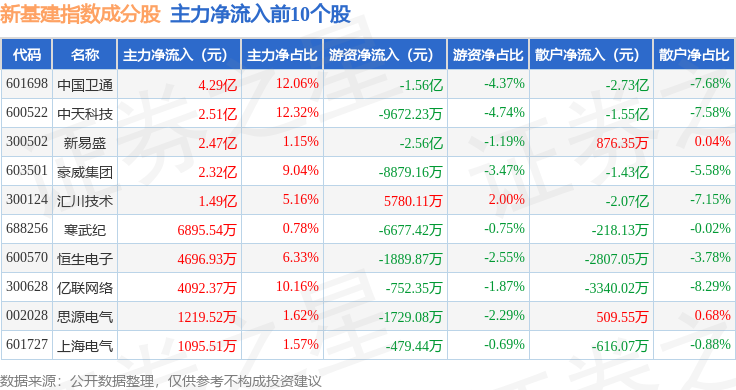 资金流向方面,新基建(980029)指数成份股当日主力资金净流出合计46.89亿元,游资资金净流入合计10.05亿元,散户资金净流入合计36.84亿元。成份股资金流向详情见下表: