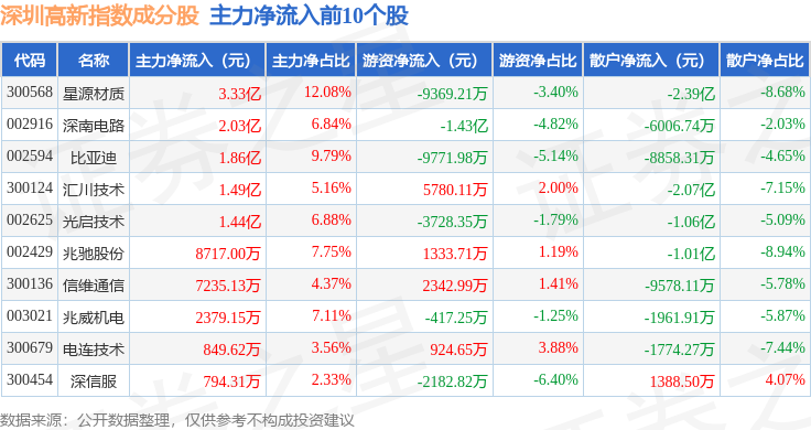 资金流向方面,深圳高新(980038)指数成份股当日主力资金净流出合计20.39亿元,游资资金净流入合计2.58亿元,散户资金净流入合计17.82亿元。成份股资金流向详情见下表: