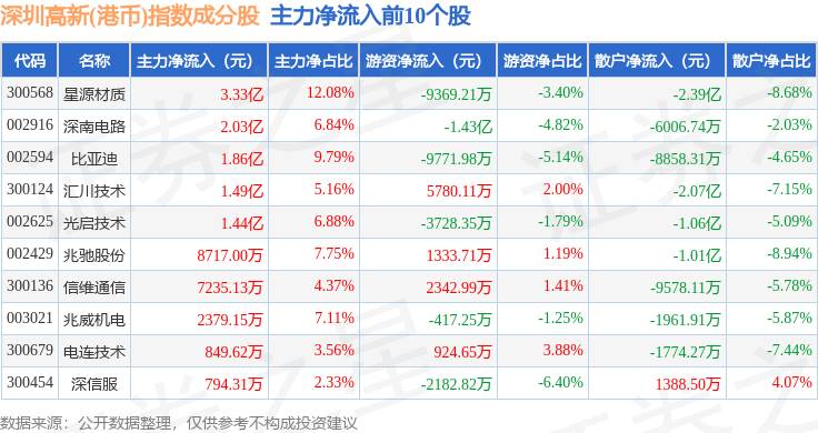 资金流向方面,深圳高新(港币)(980039)指数成份股当日主力资金净流出合计20.39亿元,游资资金净流入合计2.58亿元,散户资金净流入合计17.82亿元。成份股资金流向详情见下表: