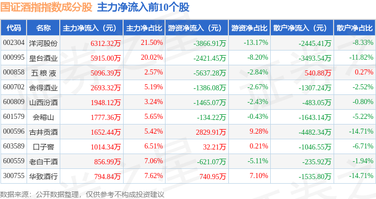 资金流向方面,国证酒指(980049)指数成份股当日主力资金净流出合计1.1亿元,游资资金净流入合计1.19亿元,散户资金净流出合计984.09万元。成份股资金流向详情见下表: