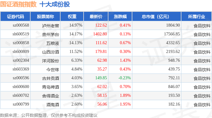 证券之星消息,12月10日,国证酒指(980049)指数报收于82398.63点,涨0.66%,成交139.92亿元,换手率1.1%。当日该指数成份股中,上涨的有25家,皇台酒业以7.67%的涨幅领涨,下跌的有2家,惠泉啤酒以0.64%的跌幅领跌。