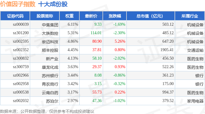 证券之星消息,12月10日,价值因子(980056)指数报收于2608.03点,涨0.1%,成交284.23亿元,换手率0.84%。当日该指数成份股中,上涨的有29家,豪迈科技以5.26%的涨幅领涨,下跌的有21家,上能电气以4.41%的跌幅领跌。