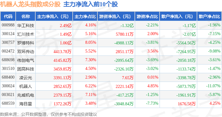 资金流向方面,机器人龙头(980071)指数成份股当日主力资金净流出合计1.18亿元,游资资金净流出合计8882.64万元,散户资金净流入合计2.07亿元。成份股资金流向详情见下表: