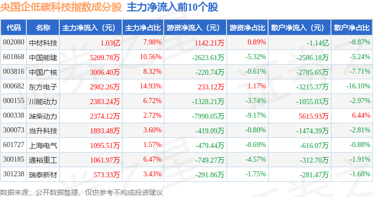 资金流向方面,央国企低碳科技(980082)指数成份股当日主力资金净流出合计9.36亿元,游资资金净流入合计2.15亿元,散户资金净流入合计7.21亿元。成份股资金流向详情见下表:
