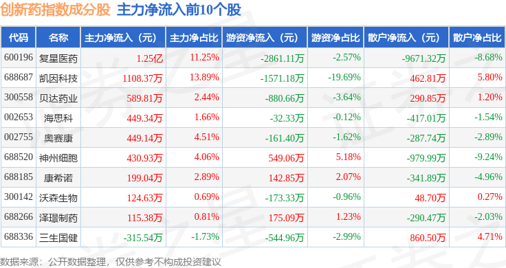 资金流向方面,创新药(980086)指数成份股当日主力资金净流出合计5.18亿元,游资资金净流入合计1.25亿元,散户资金净流入合计3.94亿元。成份股资金流向详情见下表: