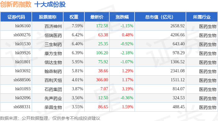 创新药(980086)指数十大成份股详情如下: