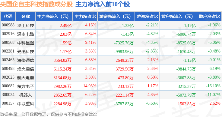 资金流向方面,央国企自主科技(980083)指数成份股当日主力资金净流出合计20.1亿元,游资资金净流入合计10.14亿元,散户资金净流入合计9.96亿元。成份股资金流向详情见下表: