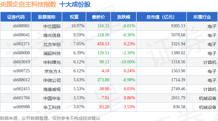 央国企自主科技(980083)指数十大成份股详情如下:
