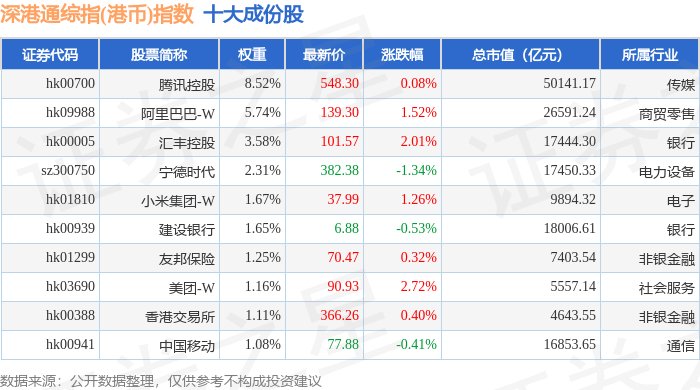 深港通综指(港币)(983006)指数十大成份股详情如下: