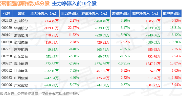 资金流向方面,深港通能源(983013)指数成份股当日主力资金净流入合计699.54万元,游资资金净流出合计7815.11万元,散户资金净流入合计7115.57万元。成份股资金流向详情见下表: