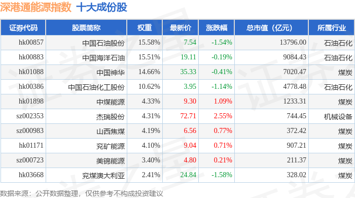 深港通能源(983013)指数十大成份股详情如下: