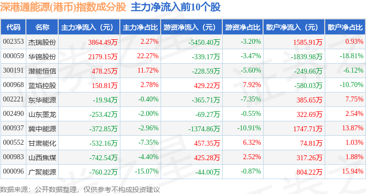 资金流向方面,深港通能源(港币)(983014)指数成份股当日主力资金净流入合计699.54万元,游资资金净流出合计7815.11万元,散户资金净流入合计7115.57万元。成份股资金流向详情见下表: