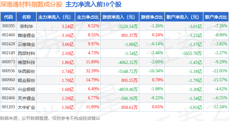 资金流向方面,深港通材料(983015)指数成份股当日主力资金净流入合计16.76亿元,游资资金净流出合计1.25亿元,散户资金净流出合计15.51亿元。成份股资金流向详情见下表: