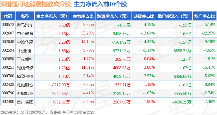 资金流向方面,深港通可选消费(983019)指数成份股当日主力资金净流出合计6.83亿元,游资资金净流出合计2.97亿元,散户资金净流入合计9.8亿元。成份股资金流向详情见下表: