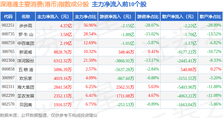 资金流向方面,深港通主要消费(港币)(983022)指数成份股当日主力资金净流入合计8.77亿元,游资资金净流出合计2.86亿元,散户资金净流出合计5.91亿元。成份股资金流向详情见下表: