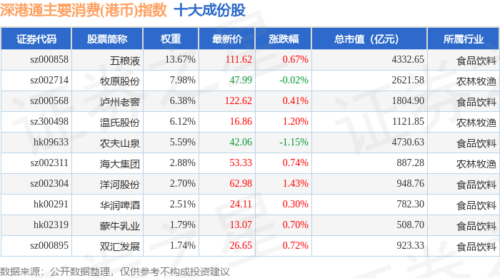 深港通主要消费(港币)(983022)指数十大成份股详情如下: