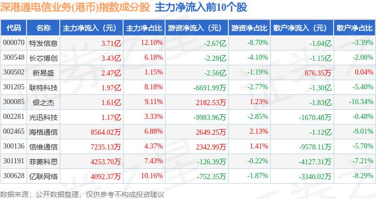 资金流向方面,深港通电信业务(港币)(983030)指数成份股当日主力资金净流出合计16.89亿元,游资资金净流出合计5.2亿元,散户资金净流入合计22.09亿元。成份股资金流向详情见下表: