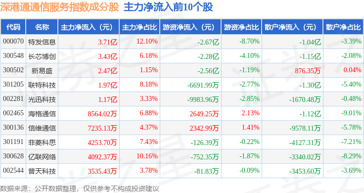 资金流向方面,深港通通信服务(983033)指数成份股当日主力资金净流出合计17.64亿元,游资资金净流出合计5.39亿元,散户资金净流入合计23.03亿元。成份股资金流向详情见下表: