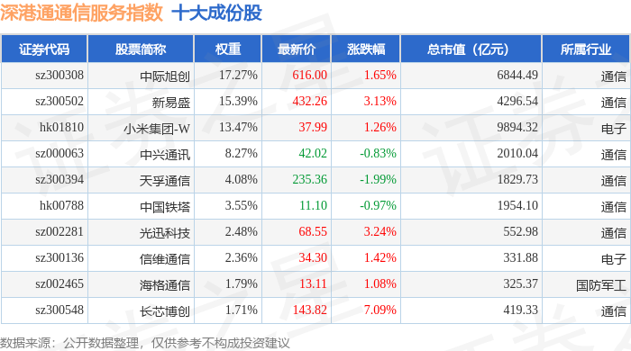 证券之星消息,12月10日,深港通通信服务(983033)指数报收于12879.35点,涨1.13%,成交1104.59亿元,换手率3.12%。当日该指数成份股中,上涨的有32家,长飞光纤光缆以10.97%的涨幅领涨,下跌的有31家,卓翼科技以3.54%的跌幅领跌。