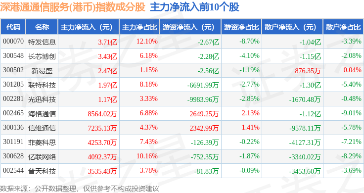 资金流向方面,深港通通信服务(港币)(983034)指数成份股当日主力资金净流出合计17.64亿元,游资资金净流出合计5.39亿元,散户资金净流入合计23.03亿元。成份股资金流向详情见下表: