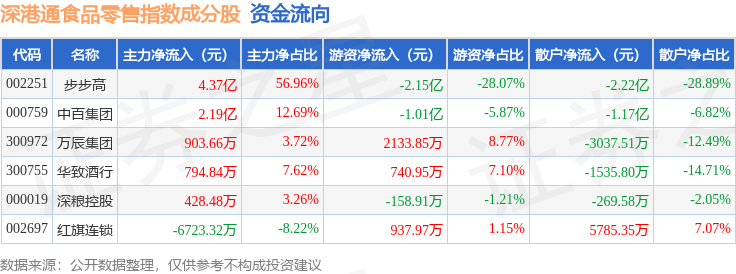 资金流向方面,深港通食品零售(983037)指数成份股当日主力资金净流入合计6.1亿元,游资资金净流出合计2.8亿元,散户资金净流出合计3.3亿元。成份股资金流向详情见下表: