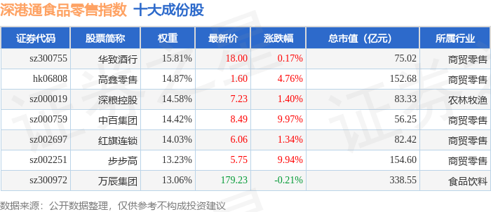 证券之星消息,12月10日,深港通食品零售(983037)指数报收于2424.52点,涨3.7%,成交38.09亿元,换手率3.54%。当日该指数成份股中,上涨的有6家,中百集团以9.97%的涨幅领涨,下跌的有1家,万辰集团以0.21%的跌幅领跌。