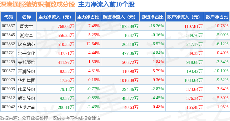 资金流向方面,深港通服装纺织(983041)指数成份股当日主力资金净流出合计1.72亿元,游资资金净流入合计1.02亿元,散户资金净流入合计6967.13万元。成份股资金流向详情见下表: