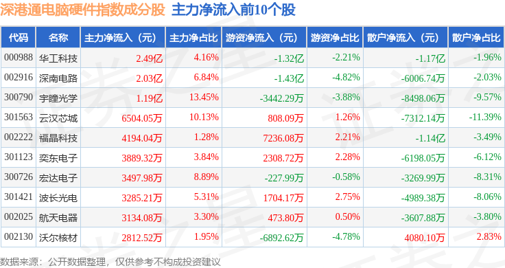 资金流向方面,深港通电脑硬件(983043)指数成份股当日主力资金净流出合计77.82亿元,游资资金净流入合计12.12亿元,散户资金净流入合计65.69亿元。成份股资金流向详情见下表: