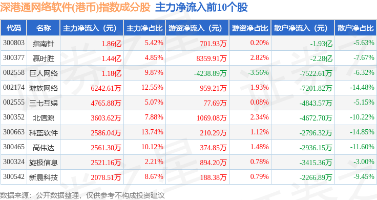 资金流向方面,深港通网络软件(港币)(983048)指数成份股当日主力资金净流出合计16.6亿元,游资资金净流入合计2.33亿元,散户资金净流入合计14.26亿元。成份股资金流向详情见下表: