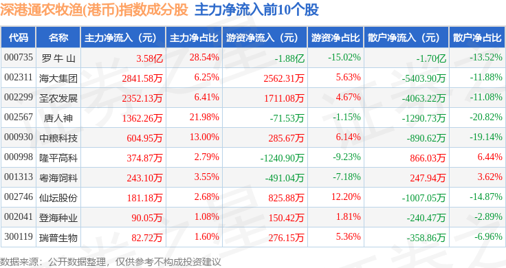 资金流向方面,深港通农牧渔(港币)(983052)指数成份股当日主力资金净流入合计2.18亿元,游资资金净流出合计1.07亿元,散户资金净流出合计1.12亿元。成份股资金流向详情见下表: