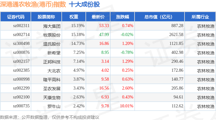 深港通农牧渔(港币)(983052)指数十大成份股详情如下: