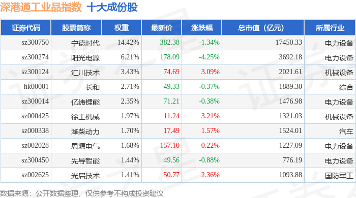 证券之星消息,12月10日,深港通工业品(983069)指数报收于6303.53点,跌0.27%,成交1611.88亿元,换手率2.21%。当日该指数成份股中,上涨的有139家,第一拖拉机股份以10.0%的涨幅领涨,下跌的有168家,国富氢能(五十)以12.92%的跌幅领跌。