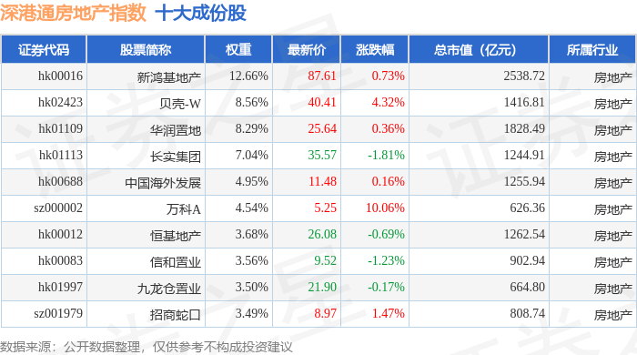 证券之星消息,12月10日,深港通房地产(983071)指数报收于2282.63点,涨1.06%,成交185.11亿元,换手率1.66%。当日该指数成份股中,上涨的有52家,万科企业以13.17%的涨幅领涨,下跌的有14家,海宁皮城以2.02%的跌幅领跌。