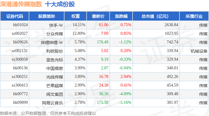 证券之星消息,12月10日,深港通传媒(983075)指数报收于2098.29点,跌0.02%,成交210.05亿元,换手率1.96%。当日该指数成份股中,上涨的有25家,博纳影业以10.05%的涨幅领涨,下跌的有20家,中国儒意以6.94%的跌幅领跌。