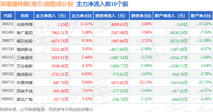资金流向方面,深港通传媒(港币)(983076)指数成份股当日主力资金净流出合计3.31亿元,游资资金净流入合计4841.72万元,散户资金净流入合计2.83亿元。成份股资金流向详情见下表: