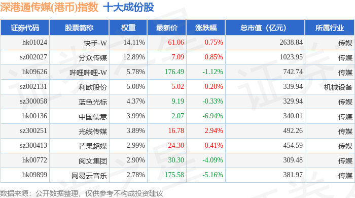 深港通传媒(港币)(983076)指数十大成份股详情如下: