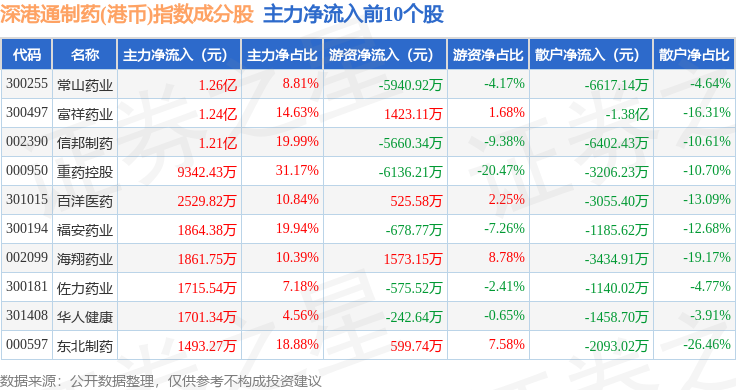 资金流向方面,深港通制药(港币)(983080)指数成份股当日主力资金净流出合计1.94亿元,游资资金净流出合计1605.91万元,散户资金净流入合计2.1亿元。成份股资金流向详情见下表: