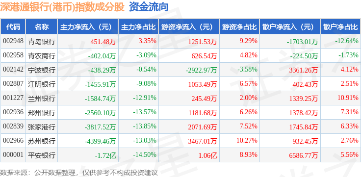 资金流向方面,深港通银行(港币)(983082)指数成份股当日主力资金净流出合计3.14亿元,游资资金净流入合计1.76亿元,散户资金净流入合计1.38亿元。成份股资金流向详情见下表: