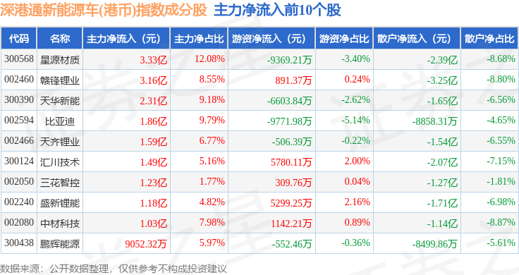 资金流向方面,深港通新能源车(港币)(983088)指数成份股当日主力资金净流入合计7699.42万元,游资资金净流出合计1.51亿元,散户资金净流入合计7423.19万元。成份股资金流向详情见下表: