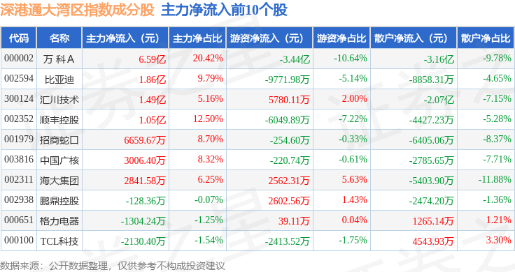 资金流向方面,深港通大湾区(983089)指数成份股当日主力资金净流出合计8.55亿元,游资资金净流出合计1.16亿元,散户资金净流入合计9.7亿元。成份股资金流向详情见下表: