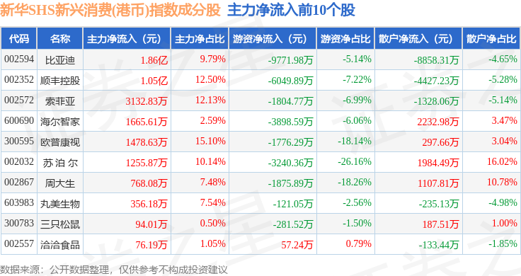 资金流向方面,新华SHS新兴消费(港币)(989007)指数成份股当日主力资金净流出合计2.12亿元,游资资金净流出合计1.82亿元,散户资金净流入合计3.94亿元。成份股资金流向详情见下表: