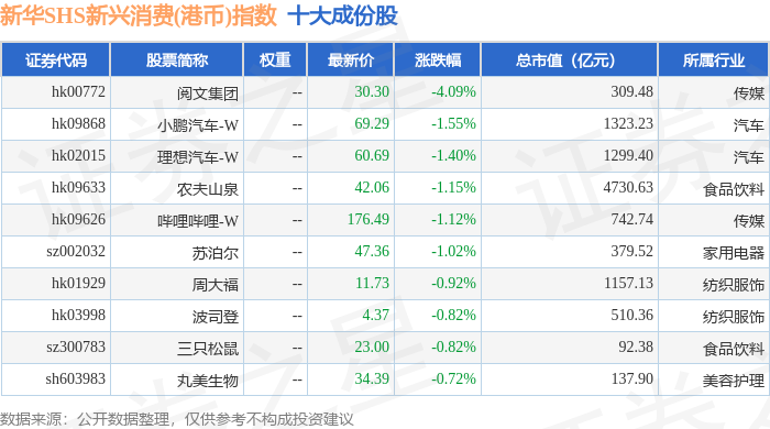 新华SHS新兴消费(港币)(989007)指数十大成份股详情如下: